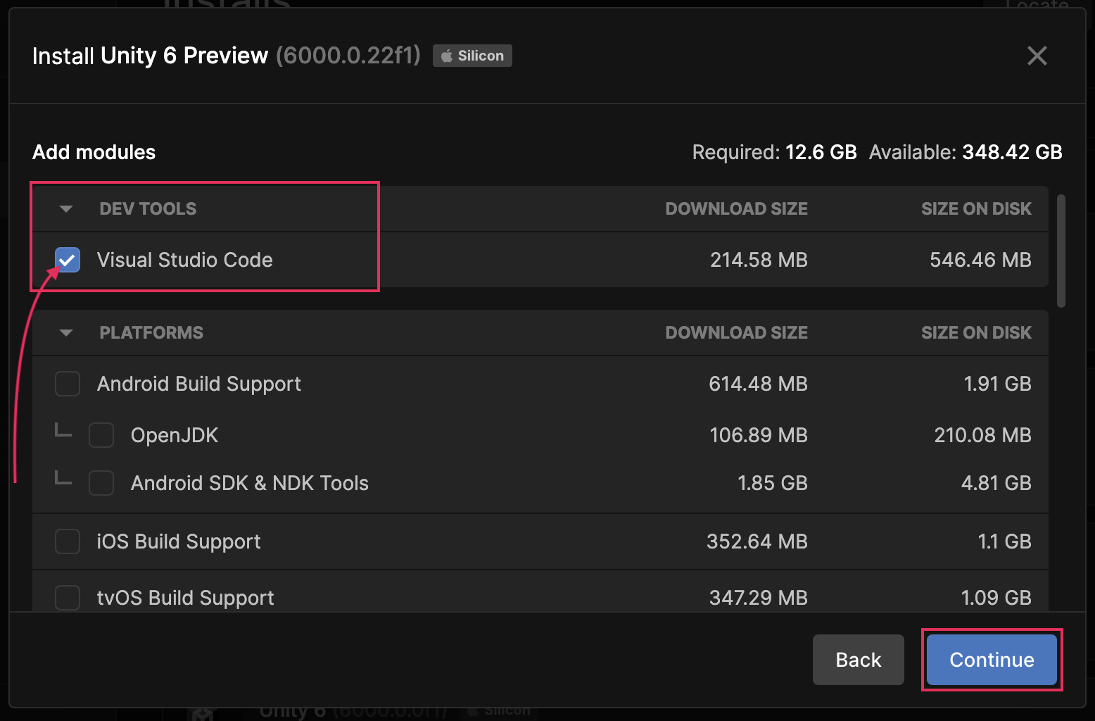 4. On the Add modules page, select the available option under DEV TOOLS to install a compatible coding application.