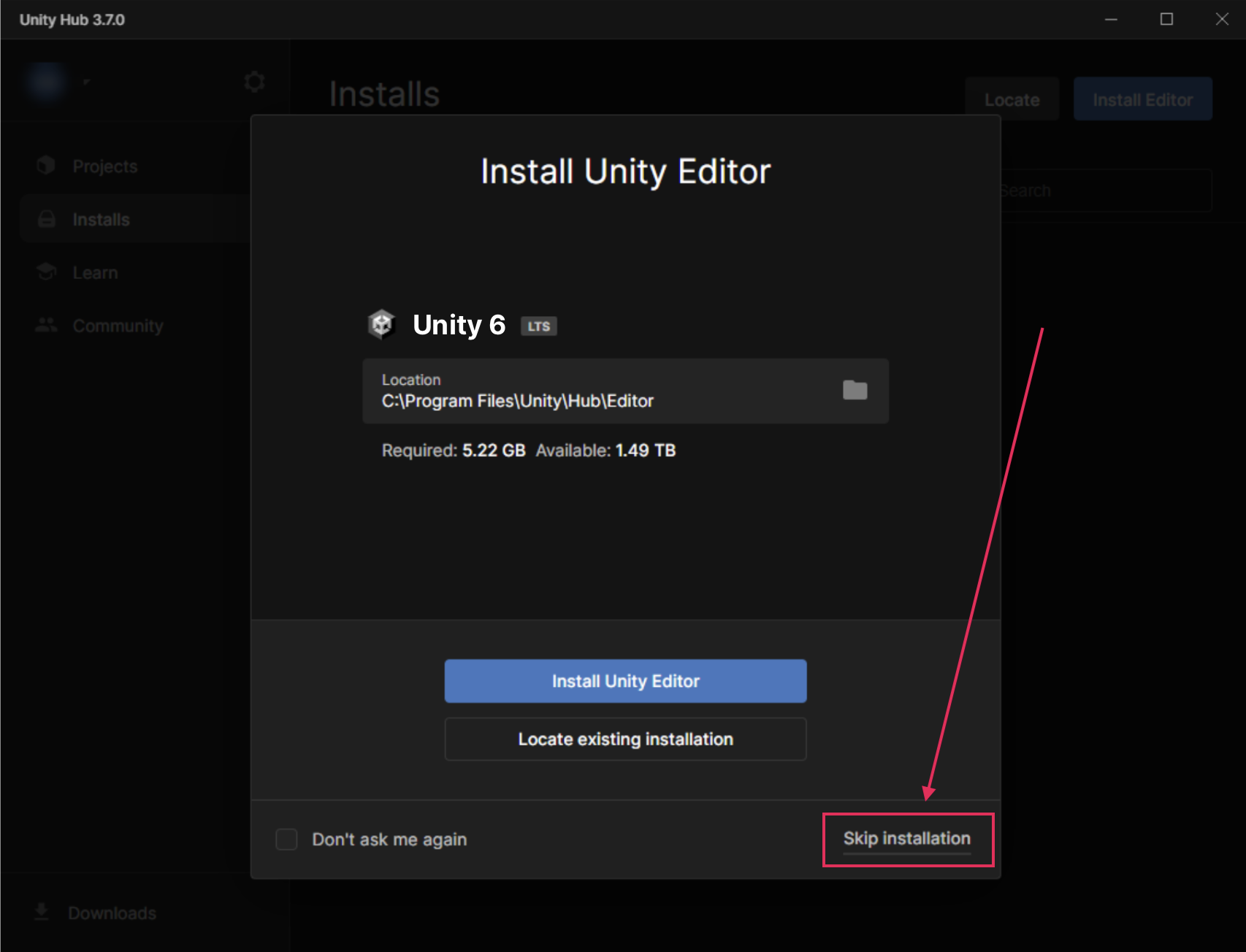 Select Skip installation and proceed to the next step where you’ll install Unity 6.