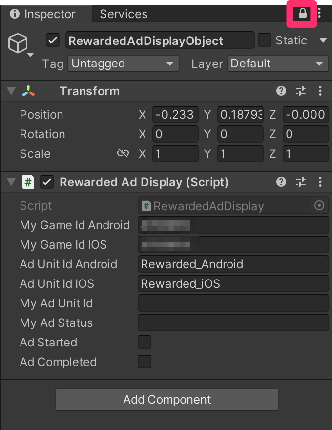 3. Direct your attention to the RewardedAdDisplay (Script) component.