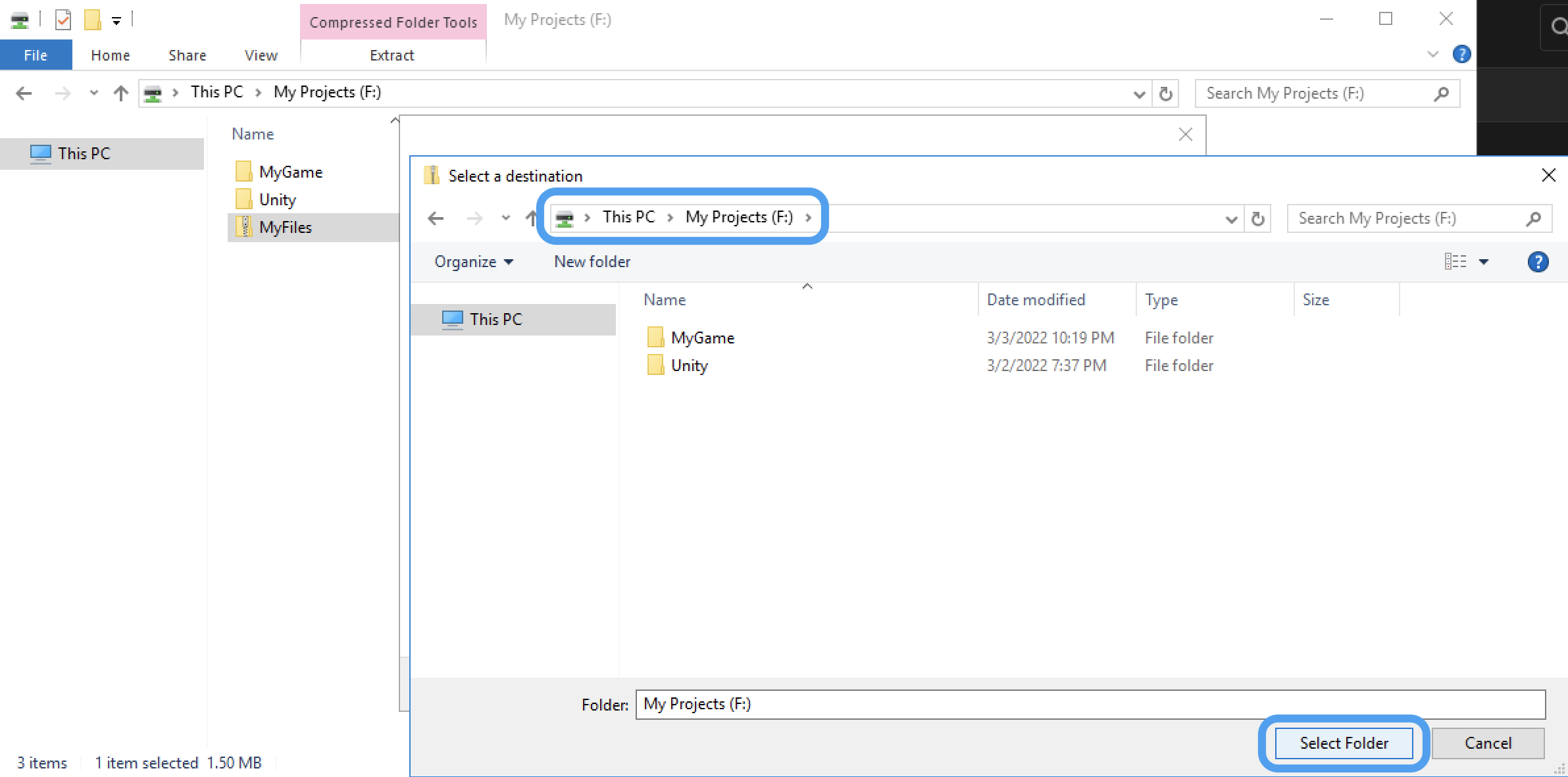 Navigate from ‘This PC’ to the ‘My Projects’ folder and click the ‘Select Folder’ button at the bottom right.