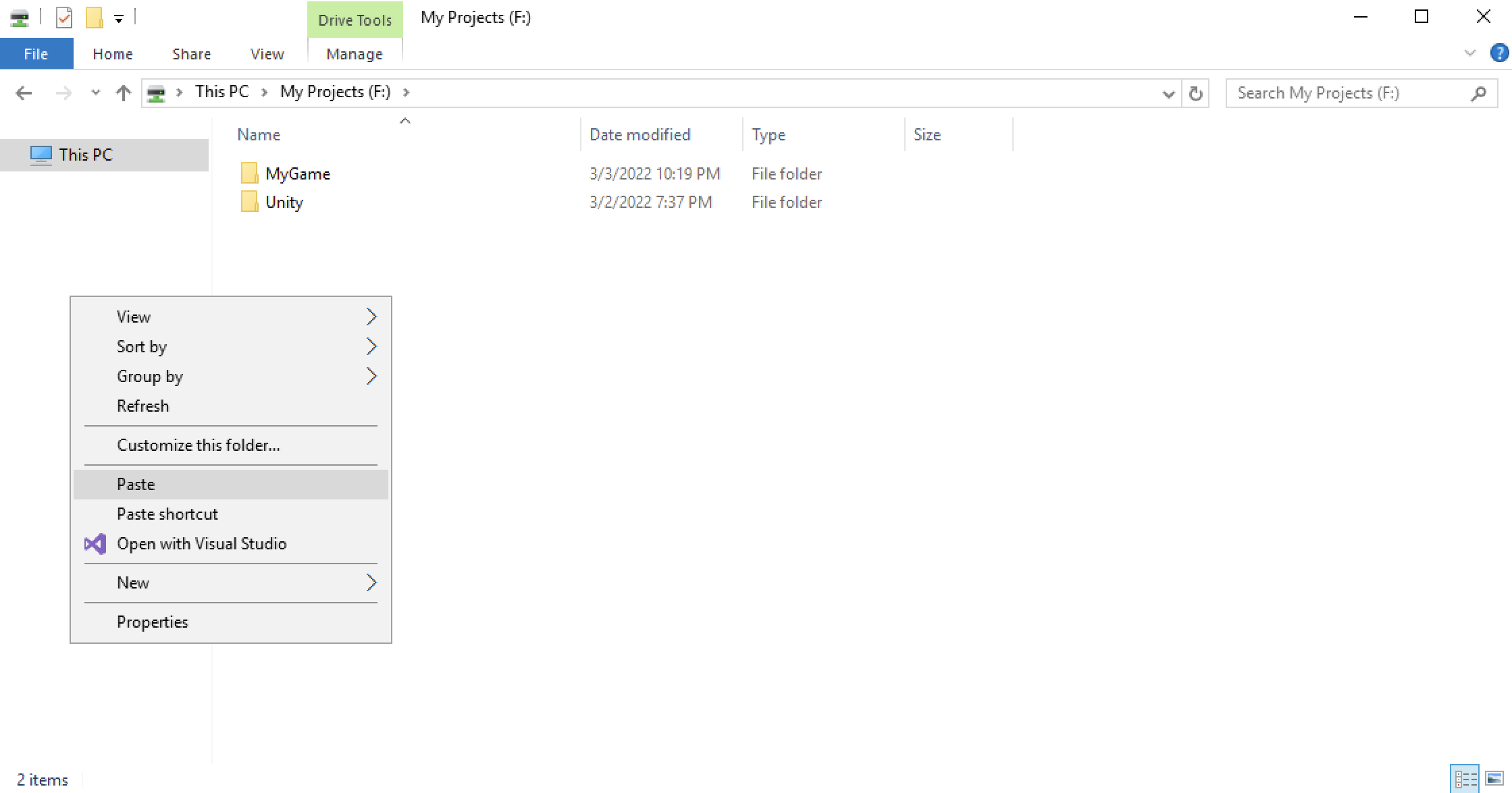 Navigate back to the ‘My Projects’ folder, right-click and press ‘Paste.’