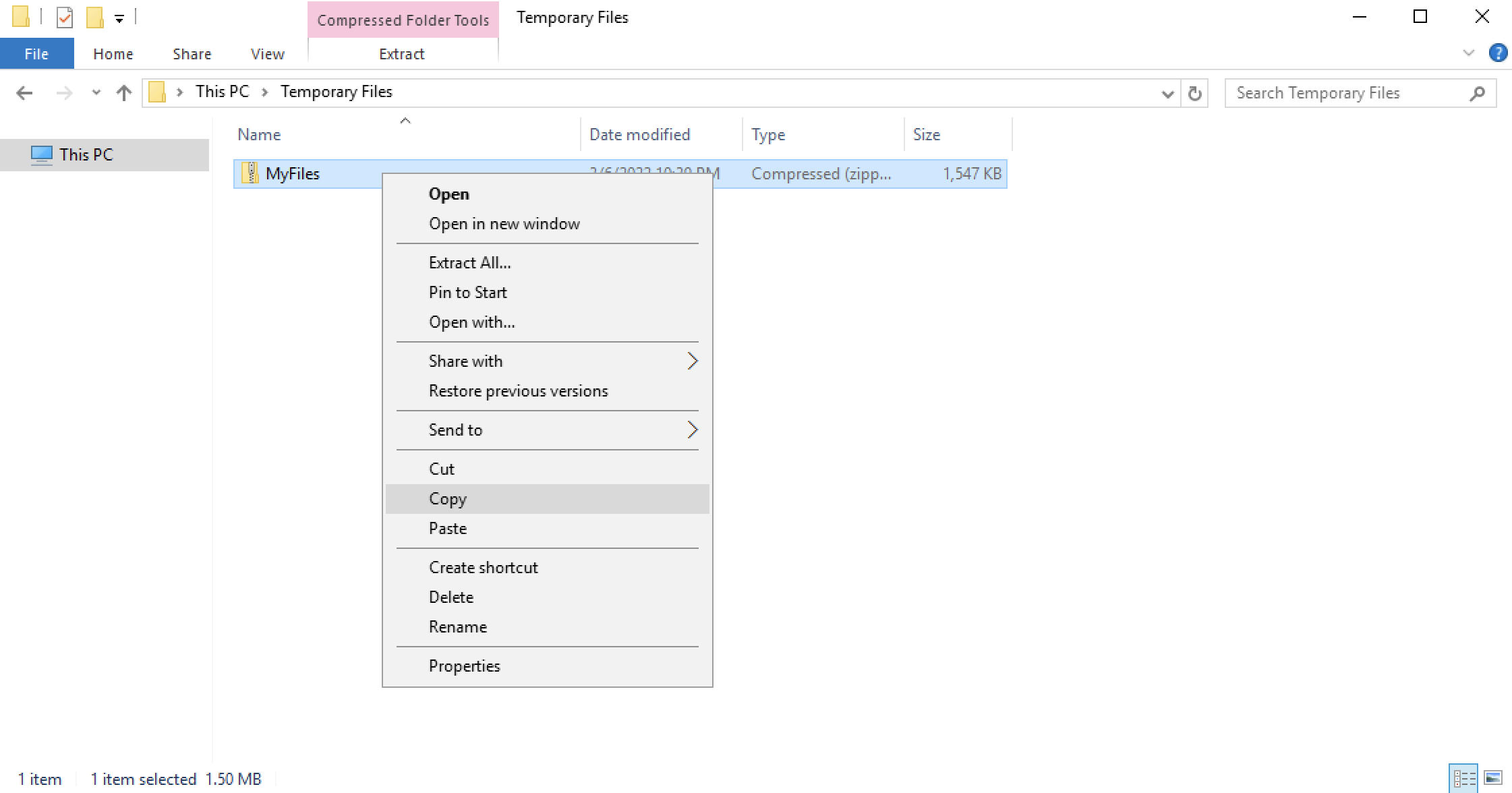 Open the File Explorer and find your uploaded zipped folder in the ‘Temporary Files’ folder. Once you’ve found it, right-click the zipped folder and click ‘Copy’.Navigate back to the ‘My Projects’ folder, right-click and press ‘Paste’.