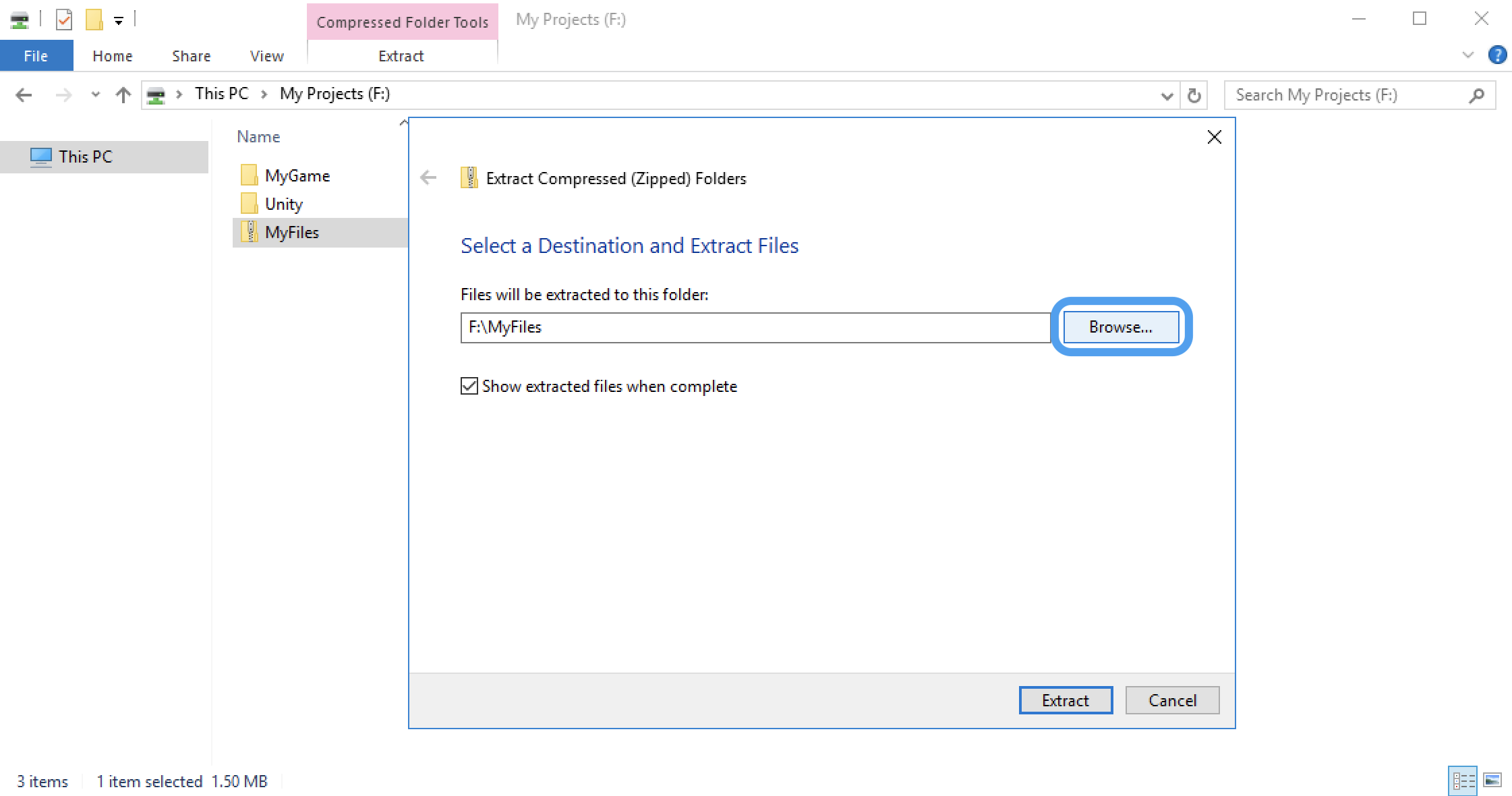 You must then select a destination for the extracted files. Click the ‘Browse…’ button.