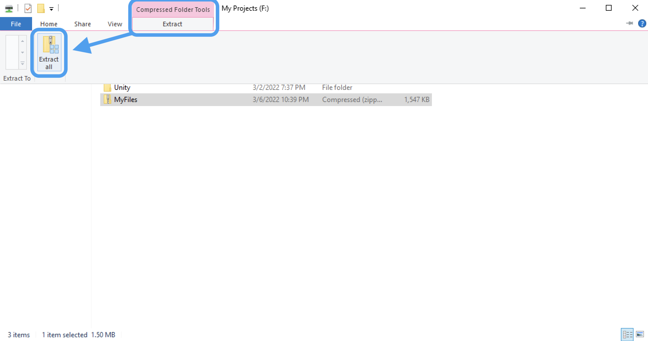 Once the zipped folder is in the ‘My Projects’ folder for permanent storage, click it to select it. Click the ‘Extract’ tab, then click ‘Extract all’.