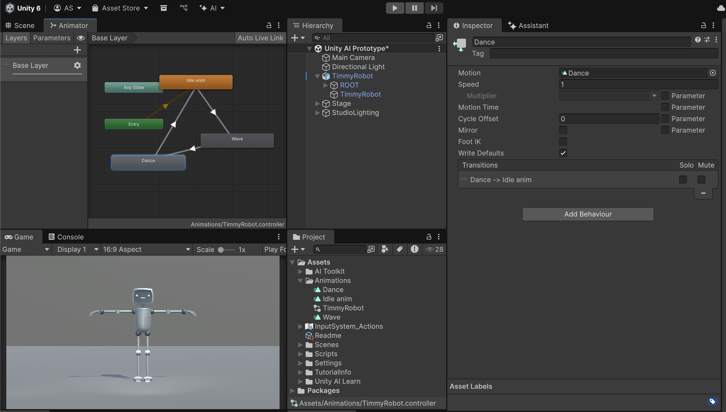 Now when you enter Play mode, your character should cycle through a series of animations, creating a loop like idle → wave → dance → idle.