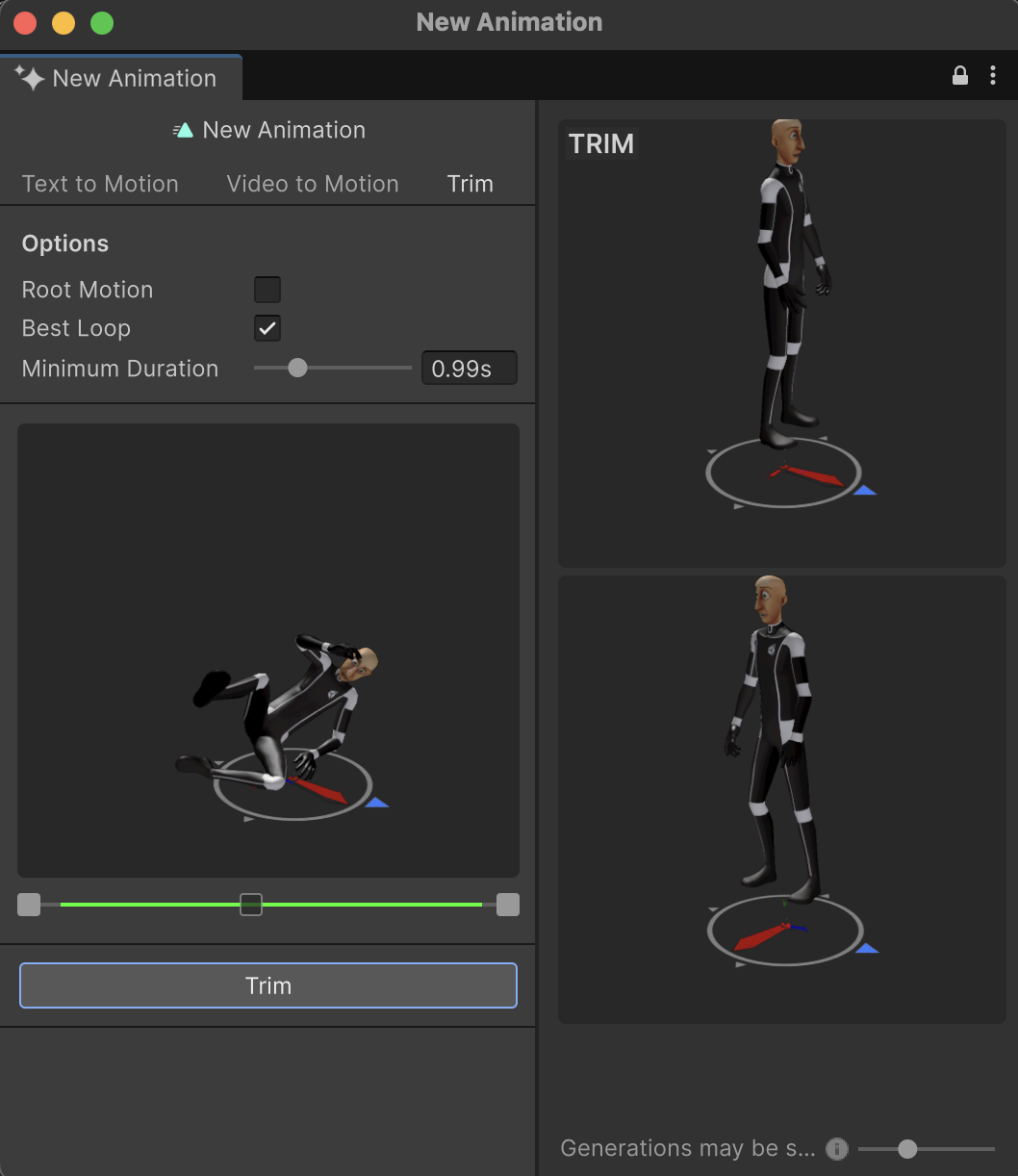 - With an animation clip selected, select the Trim (or Edit) tab to further refine your animation. This tab helps you ensure that your character is facing the correct direction, stays in the same place, and loops smoothly.