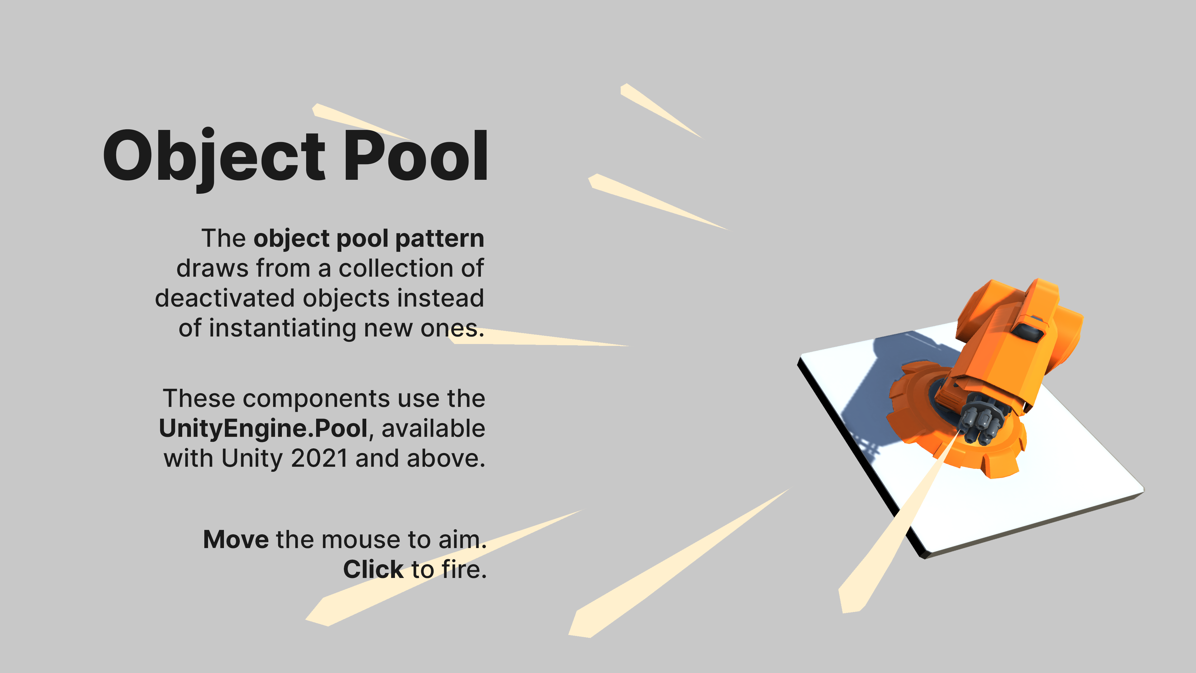 The image below illustrates a common use case for object pooling, that of firing projectiles from a gun turret. Let’s unpack this example step-by-step.