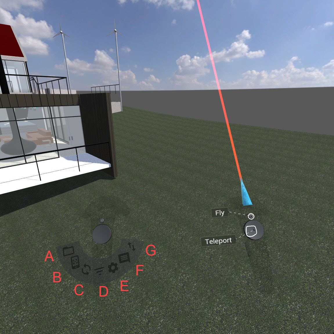 All of the viewer tools are housed in the menu wheel on the left controller below the trackpad (Figure 03). To select the different tools, you can either use the left trackpad to swipe toward your selection, or use the right controller to click on the tool by pointing at it and pressing the right trigger. The first four tools are the same as in the desktop version of the viewer, while the last two are specialized for VR. Clicking on one of the tools will bring up a pop-up UI that will either be tied to the left controller, or exist in world space in front of the viewer. Pop-ups attached to the left controller may be closed by clicking on the left trackpad, and world space UIs have a close button on the left side of their menu.