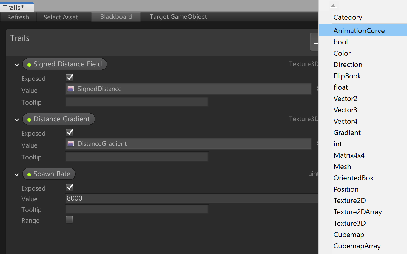 変数の Exposed プロパティがチェックされていると、VFX Graph エディターの外にある Inspector で修正することができます。
