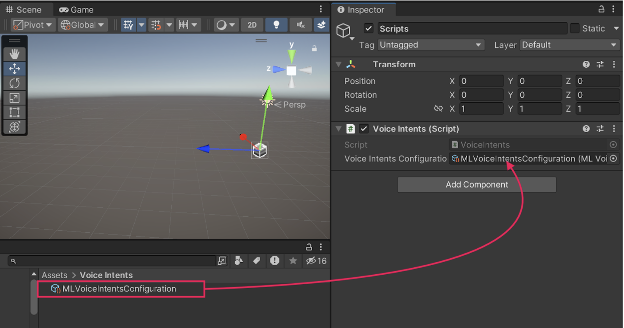 In order for the Magic Leap 2 to respond to voice commands, you need a reference to the voice intents configuration object in your script.