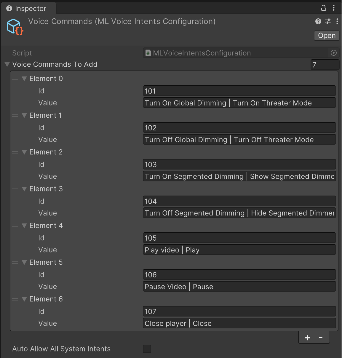 • Creates a variable for the voice intents configuration object - this needs to be assigned in the Inspector.