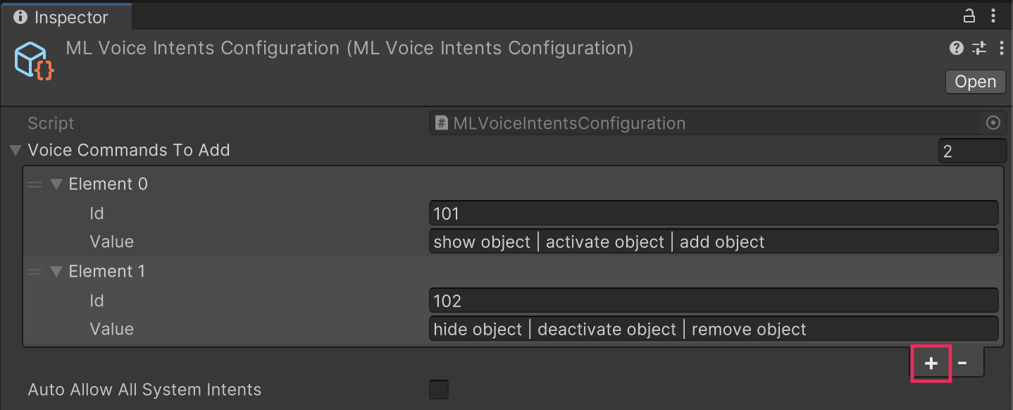 2. In the Inspector window, select the Add (+) button to add a new voice command, then expand Element 0.