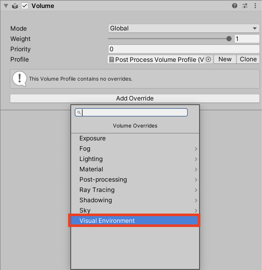 Each setting in the Visual Environment has a corresponding Override. For example, if you choose a Gradient Sky in your Visual Environment, you’ll also need to add a Gradient Sky Override to your Volume