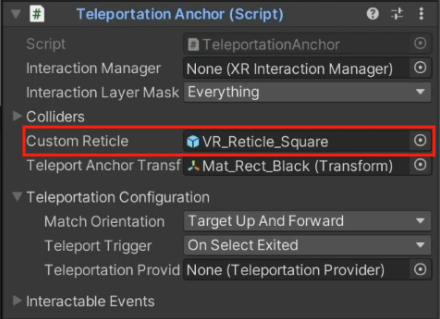 - In the Teleportation Anchor component, for the Custom Reticle property, assign the Reticle.