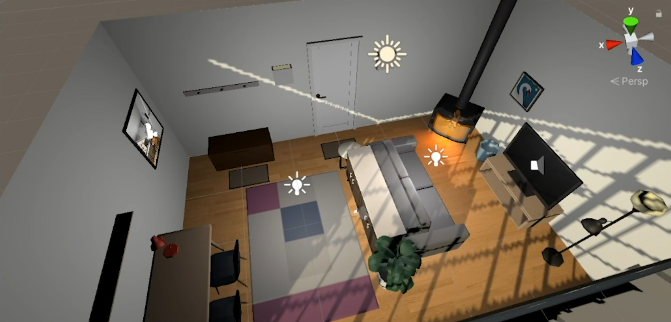 - Go to Course Library > Prefabs > Rugs, then add smaller “Mat” objects at key locations around the room.