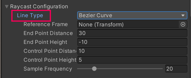 Note: You may find that in the updated version of the XR Interaction Toolkit, the ray from your controller bends to the teleportation area. This can be very helpful and usually improves the user experience. If you wish to switch the ray to a straight line, as shown in the video, you can do so by selecting the relevant controller in the Hierarchy window, then, in the Inspector window, find the XR Ray Interactor component and change the Line type under the Raycast Configuration.