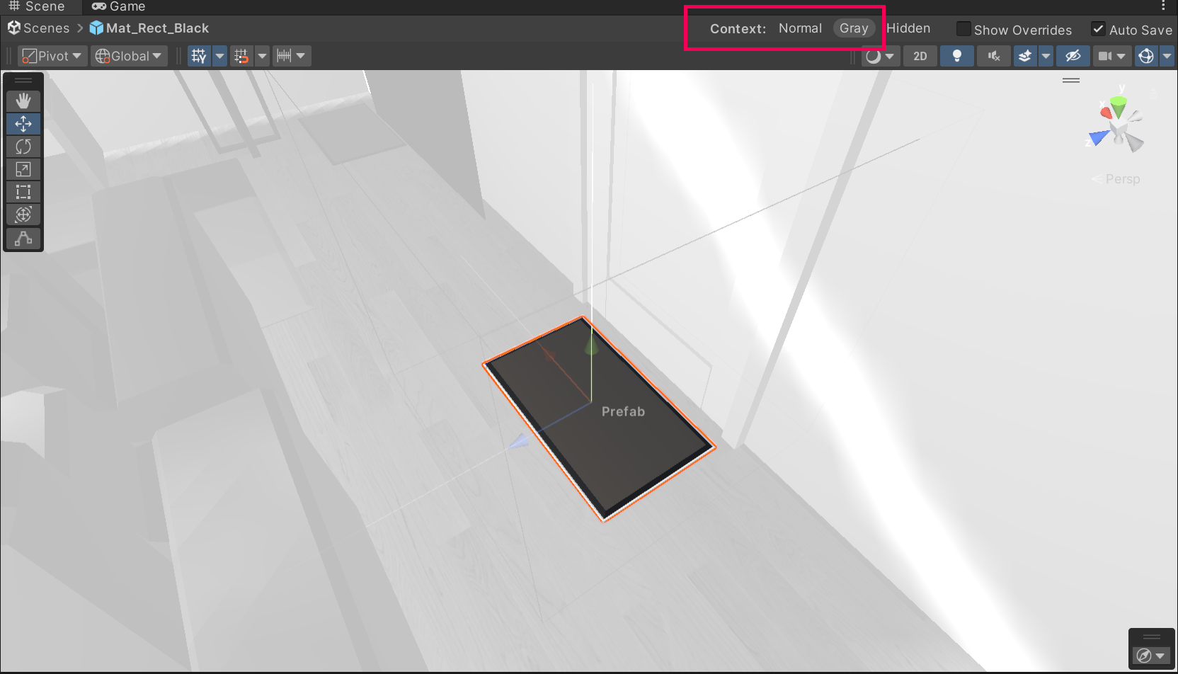 - Select one of the mat objects and click the Open button at the top of the Inspector. You can change how the mat prefab is displayed when open with the Context option on the toolbar above the viewport. To set it as shown in the video, select the Gray option.