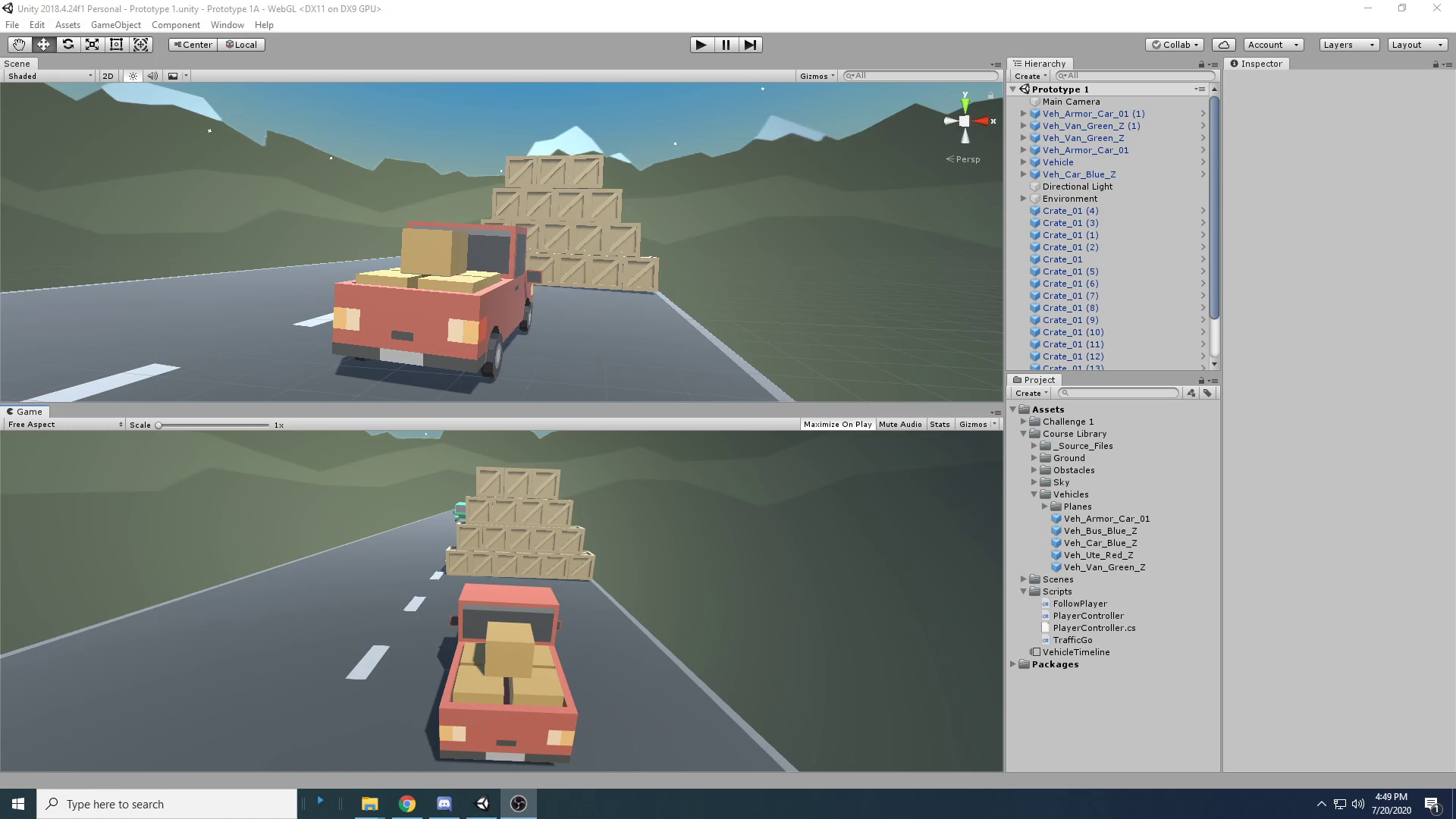 This week, you will program a car moving side-to-side on a floating road, trying to avoid (or hit) obstacles in the way. In addition to becoming familiar with the Unity editor and workflow, you will learn how to create new C# scripts and do some simple programming. By the end of the week, you will be able to call basic functions, then declare and tweak new variables to modify the results of those functions.