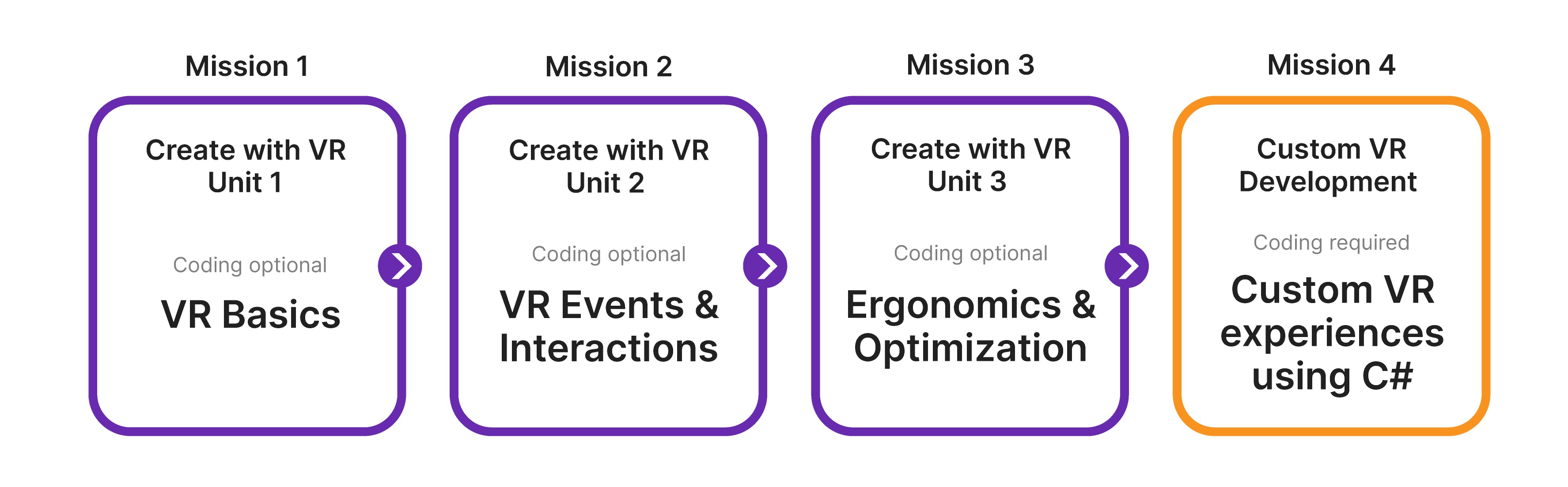 The first three missions contain the Create with VR course content. Here, you will create prototypes, attempt challenges, and complete quizzes. You will also complete a unique VR project from start to finish, beginning with a blank design document and ending with a fully functional project.