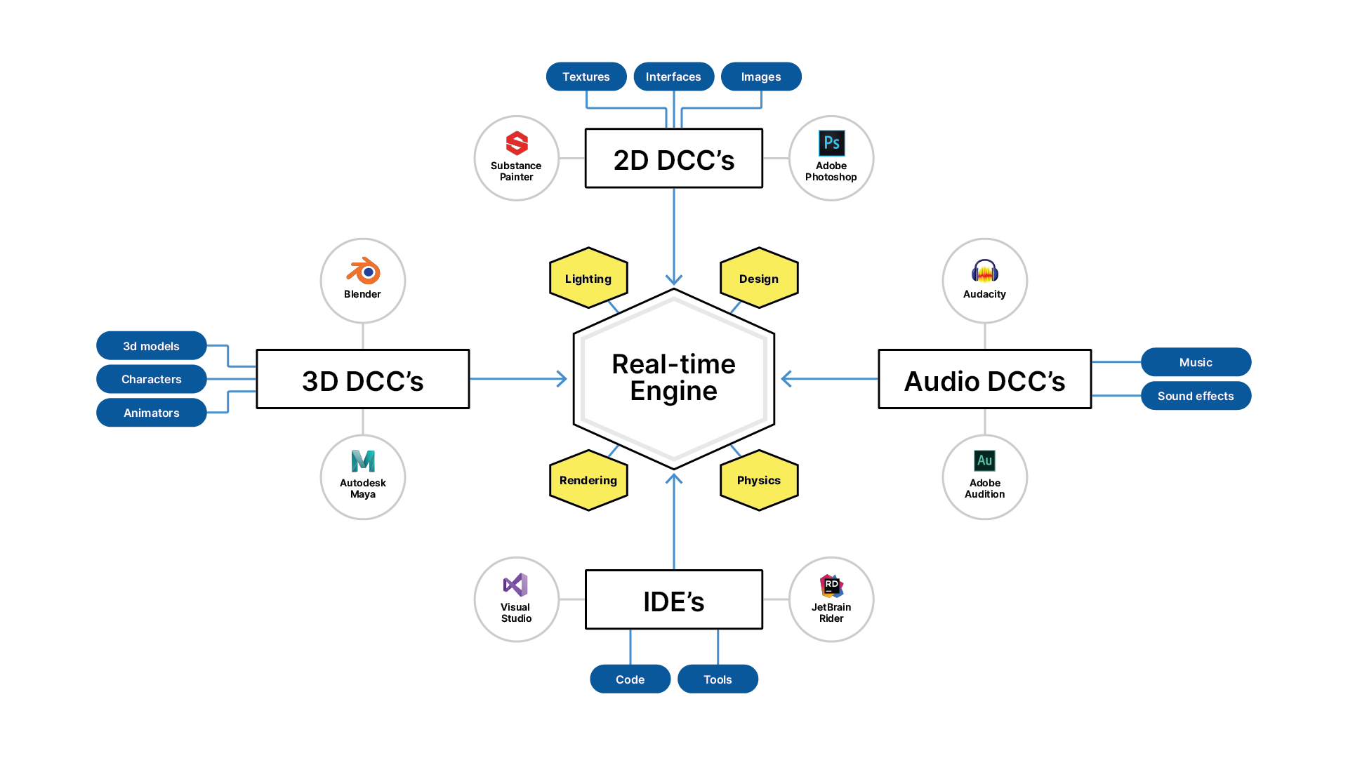 - 2D DCCs: programs for creating 2D images, illustrations, textures, and interfaces; examples: Photoshop, Illustrator, Substance Painter, and Gimp.