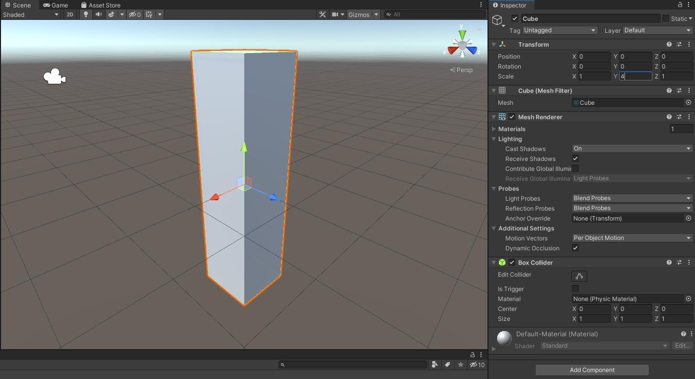 4. With Cube selected, change the Y value of the Scale in the Transform component to 4. Zoom out as needed.