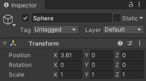 6. Select the Sphere GameObject and notice its coordinates in the Transform component. These are relative coordinates, which store the Sphere’s relationship to Cube — not Sphere’s position, rotation, and scale in the scene! Rotation values are 0, 0, 0, and Scale values are 1, 1, 1.