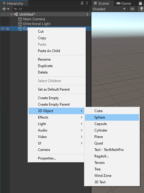 1. In the Hierarchy window, right-click the Cube GameObject so that it is selected and a context menu appears.