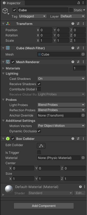 With Cube selected, the Transform component displays the size, rotation, and position of the Cube GameObject in the scene using X, Y, and Z values. By default, these values are in meters.