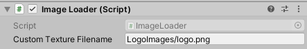 }10. You can also load images from any StreamingAssets subfolder. Let’s say your image file is named “logo.png” and is in a subfolder called “LogoImages.” In this case, you’d specify “LogoImages\\logo.png” for customTextureFilename if referencing this file in the script. We will use the double-slash \\ to reference the folder location and image name. (A single slash \ is used as an escape sequence for including special characters in the code, and wouldn’t work in this case) You don’t need to use \\ if you’re just typing the file name in the Unity Inspector. In that case, you’d just enter LogoImages\logo.png (Figure 02).