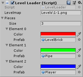 15. Click to select LevelLoaderObject. Click the triangle next to Pieces in its Inspector. Set Size to the number of colors you used (aside from the background color).