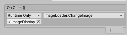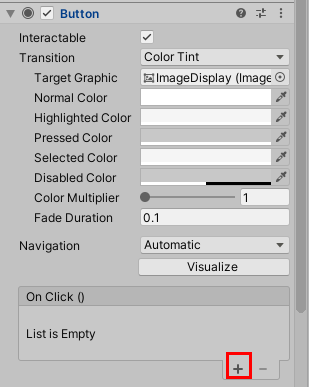 12. With the ImageDisplay button selected in the Hierarchy window, click In the Inspector window, and on the Button properties, click + to add an action to its OnClick event listener (Figure 03).
