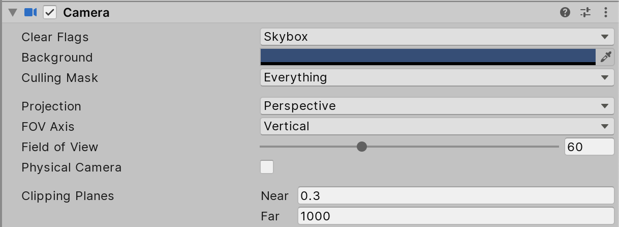 To create a Camera, select Camera from the GameObject drop-down. The camera type and options are then set using the Camera’s Inspector.
