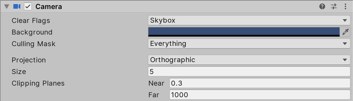 The size of an Orthographic Camera specifies how many Unity units fit vertically between the Camera and either the top or bottom edge of the screen. In 2D projects, this is directly related to the Pixels Per Unit setting for Sprites. For example, let’s say we have a 2D project where the Sprites are 16 pixels per unit tall and we want to fit 12 Sprites vertically on screen. The Camera’s orthographic size would be set to six. Orthographic cameras are most often used in 2D projects, but may also be used in 3D to avoid perspective distortion.