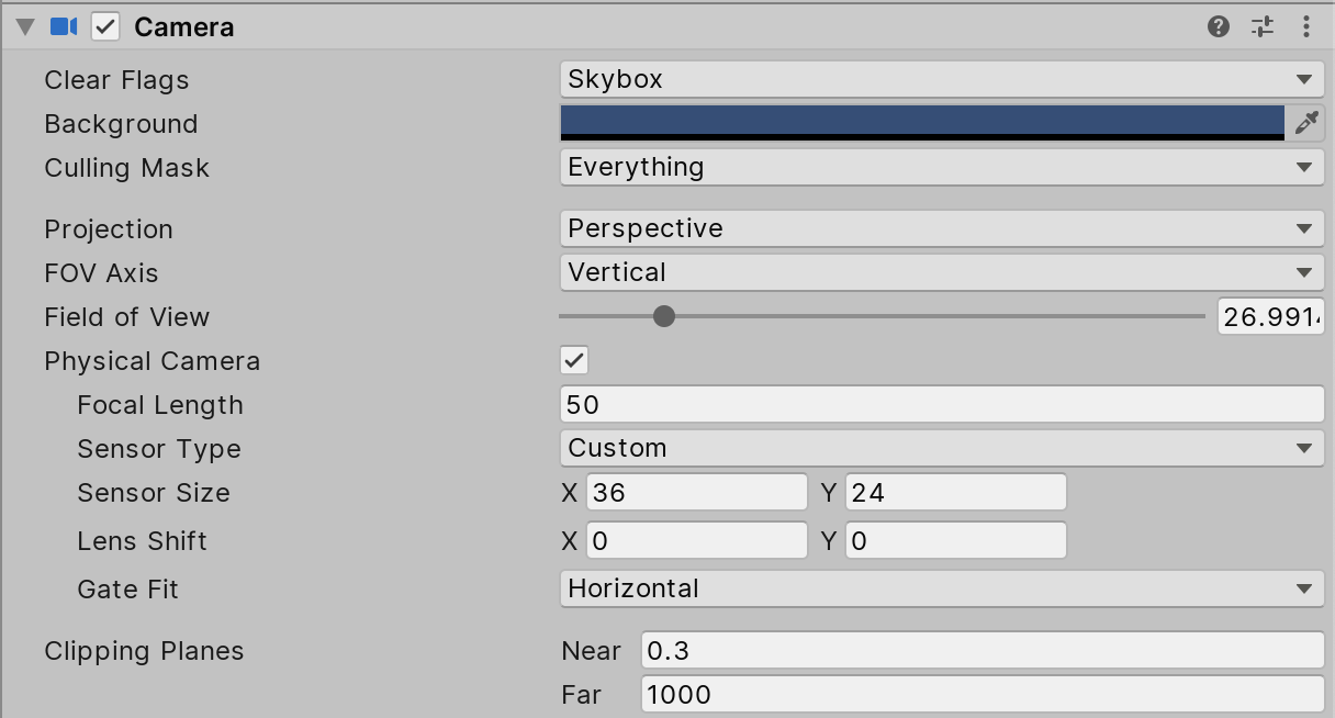In addition to Field of View, the Physical Camera’s coverage can be specified by two related settings: Sensor Size, matching the sensor size of a real or imaginary film camera, as well as Focal Length. The Sensor Size is the physical size of the area onto which the image is rendered (or “filmed”), and the Focal Length is the distance between the lens and the film/sensor.