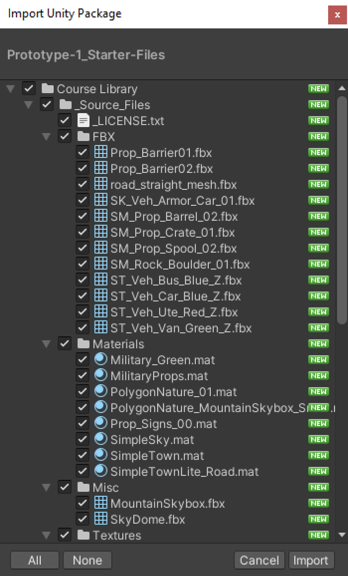 Press the ‘Import’ button, and all of the assets will be added to your project’s ‘Asset’ folder for you to work with.