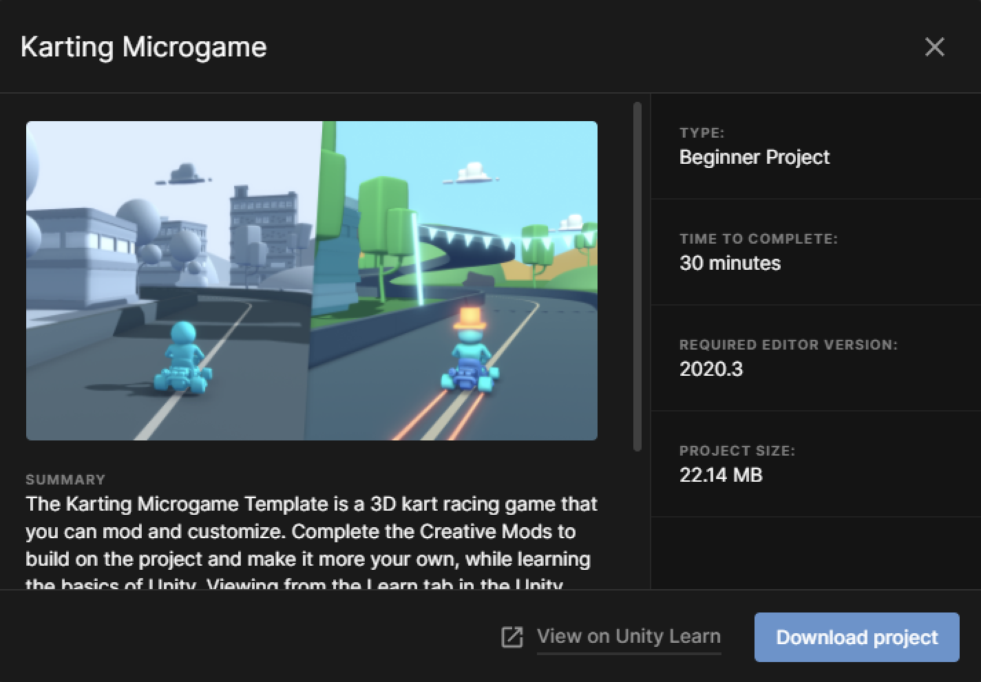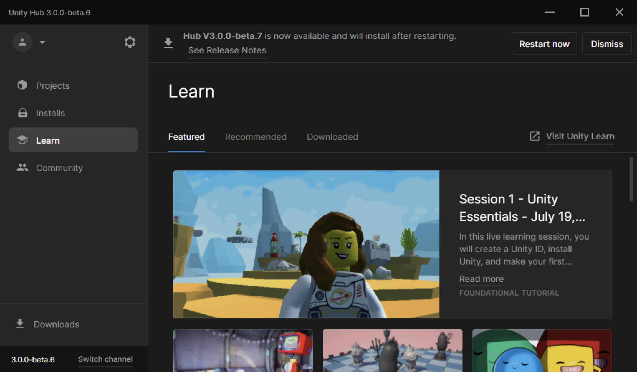 Additional projects can be found under the ‘Learn’ tab in the Unity Hub window.