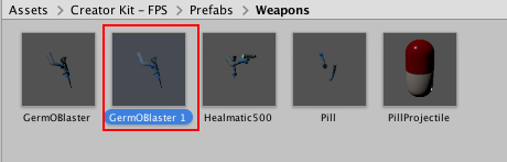 2.选择 GermOBlaster 预制件。按 Ctrl + D (Windows) 或 Cmd + D (macOS) 来复制一个副本。
