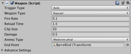 2.在 Inspector 中,找到 Weapon 组件。这是为此创作者套件编写的自定义脚本,具有许多不同的可配置值。