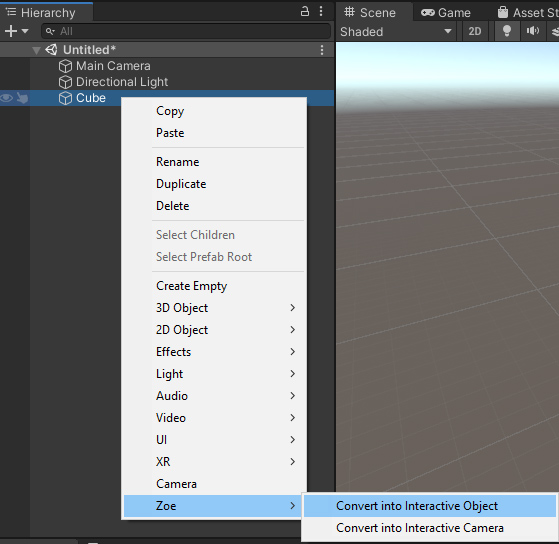 Expand the Activity1 in your Hierarchy. You can see the assets used in this first activity. Select the ‘Fork’, right-click on it and go to Zoe > Convert Into Interactive Object: