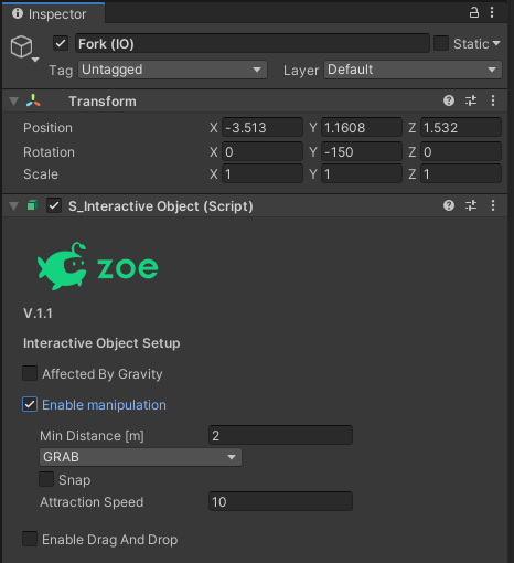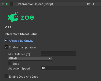 Check “Enable Manipulation”. The ‘Min Distance’ is the distance from which the user can manipulate the object. If the user is further away the object won’t react. Leave ‘2’ meters which is a comfortable distance for the user to interact with the object.