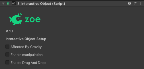 To be able to interact with objects Zoe needs them to be what we call Interactive Objects or IOs. An interactive object has a specific structure and specific components attached to it in order to be aware of other (IO)s in the scene and also of the user.