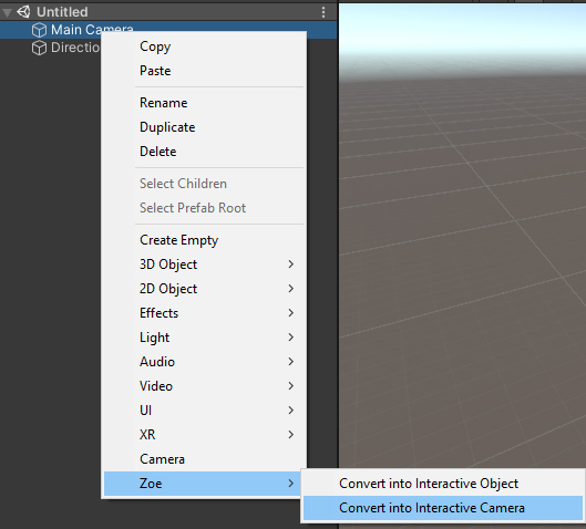 If you are creating a scene from scratch select the Main Camera, right-click on it and go to Zoe > Convert Into Interactive Camera.